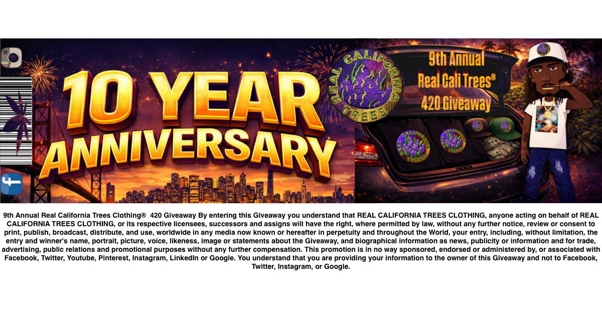 Come celebrate 10 years in the fashion game with Real Californian Trees Clothing® We will be hosting our 9th Annual RCT 420 Giveaway sign up at realcalitrees.com Starting 3/28/26. On 04/03/26 the first Weekly prizes will be given away also on 4/10/26, 4/17/26 and 4/19/26 Weekly prizes will be given away leading up to the Grand Prize on 4/20/26. When we will choose the Grand Prize Winner at 4:20 PM. All entries must be in by 4/20/26 at 4:20 PM (Central/America/Chicago Time). Sign-up For your chance to win Starting 3/28/26 no purchase necessary Good Luck!